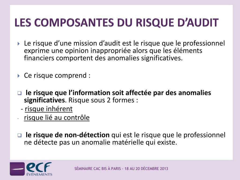 LES COMPOSANTES DU RISQUE D’AUDIT • Le risque d’une mission d’audit est le risque que le professionnel exprime une opinion inappropriée alors que les éléments financiers comportent des anomalies significatives. • Ce risque comprend : • le risque que l’information soit affectée par des anomalies significatives. Risque sous 2 formes : - risque inhérent • risque lié au contrôle • le risque de non-détection qui est le risque que le professionnel ne détecte pas un anomalie matérielle qui existe.