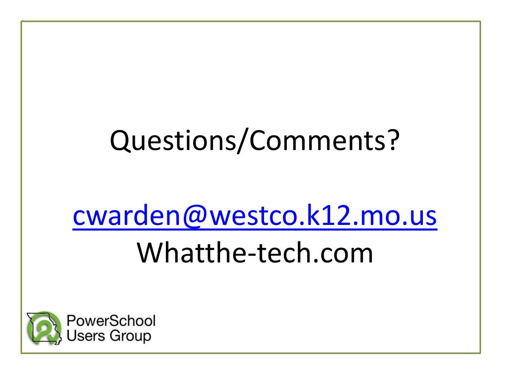 A little bit about me…* Third year with PowerSchool* I wear many hats; including that of MOSIS/PowerSchool support* whatthe-tech.com – blog, reviews and other articles, links, downloads (including customized PowerSchool nursing pages and reports that my wife made me do)