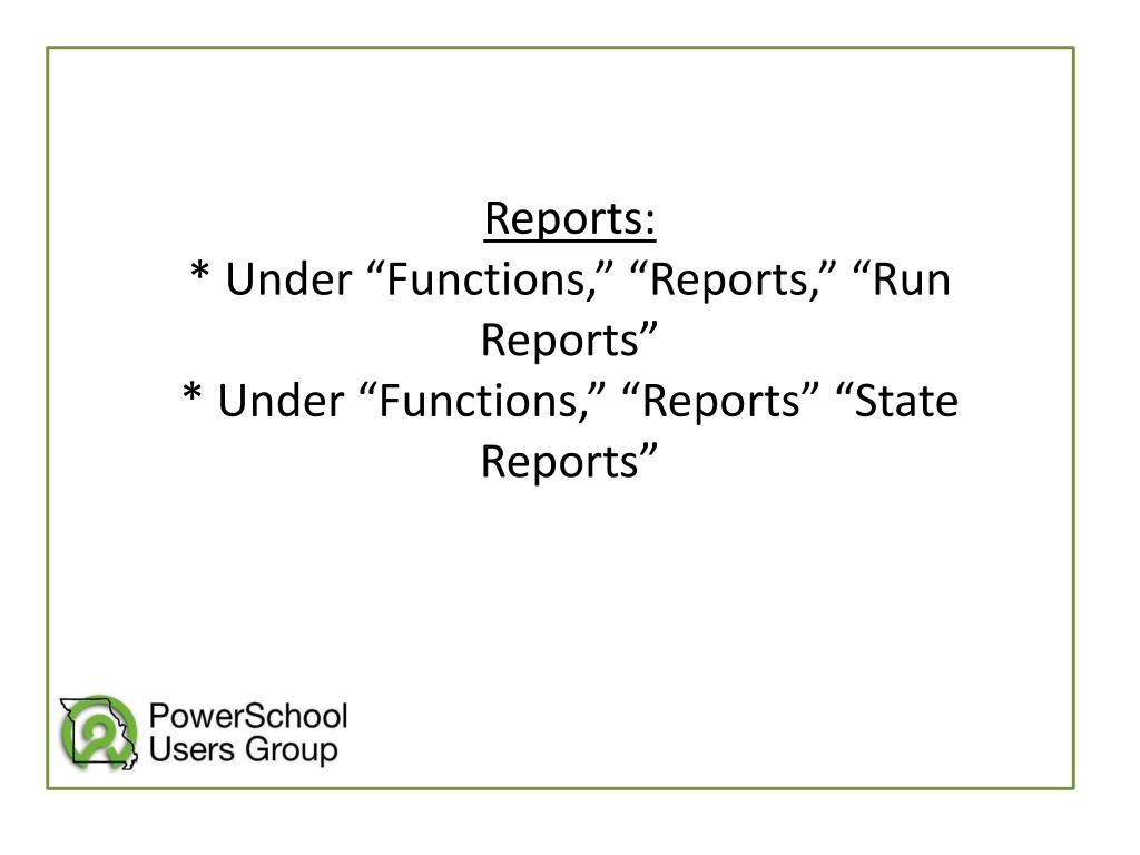 State ReportsWhen state reporting is coming due, we: • Send out an email in advance to all those affected (I.E. counselors, principals, those responsible for that particular cycle’s requirements) • Attach the corresponding DESE template/spreadsheet to the email and explain the fields and where they are in PowerSchool • No excuses. This is done to “double check” that the data is up-to-date.