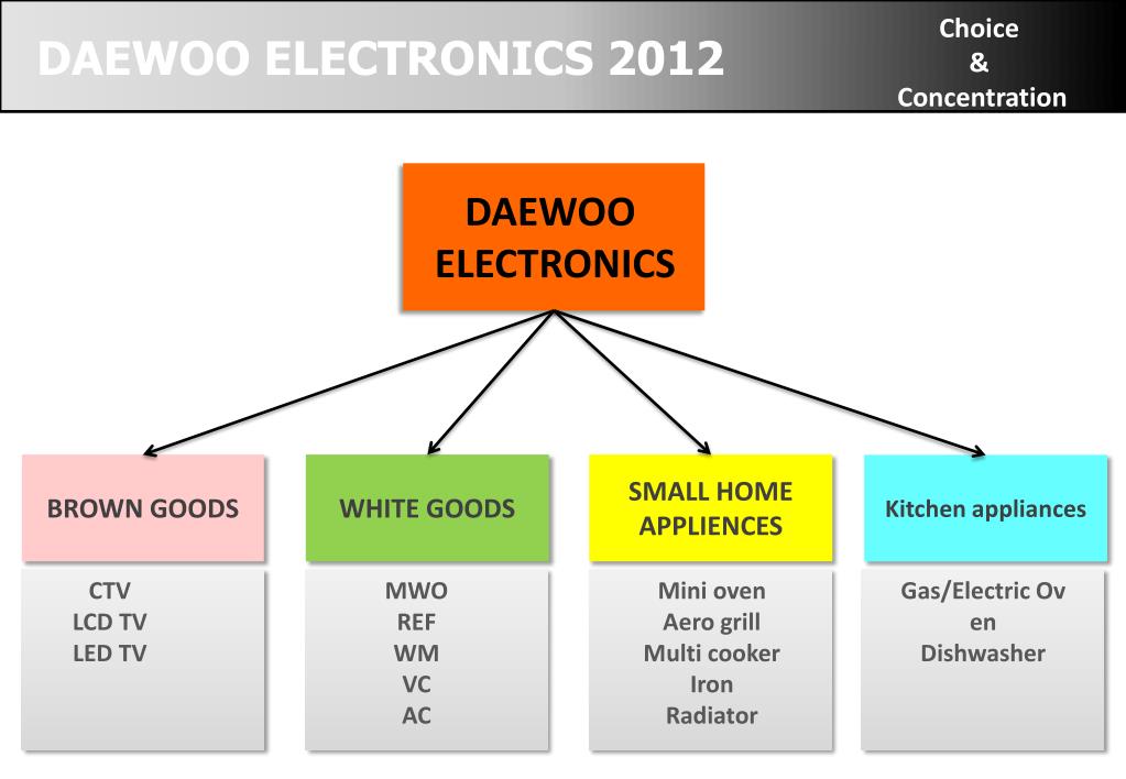 Choice & Concentration DAEWOO ELECTRONICS DAEWOO ELECTRONICS 2012 BROWN GOODS WHITE GOODS SMALL HOME APPLIENCES Kitchen appliances CTV LCD TV LED TV MWO REF WM VC AC Mini oven Aero grill Multi cooker Iron Radiator Gas/Electric Oven Dishwasher