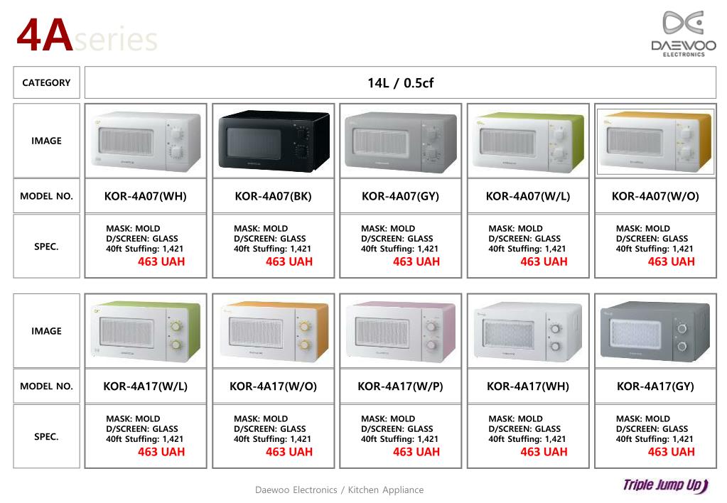 4Aseries CATEGORY 14L / 0.5cf IMAGE NEW! NEW! MODEL NO. KOR-4A37 KOR-4A67 SPEC. MASK: MOLD D/SCREEN: GLASS 40ft Stuffing: 1,421 463 UAH MASK: MOLD D/SCREEN: GLASS 40ft Stuffing: 1,421 463 UAH
