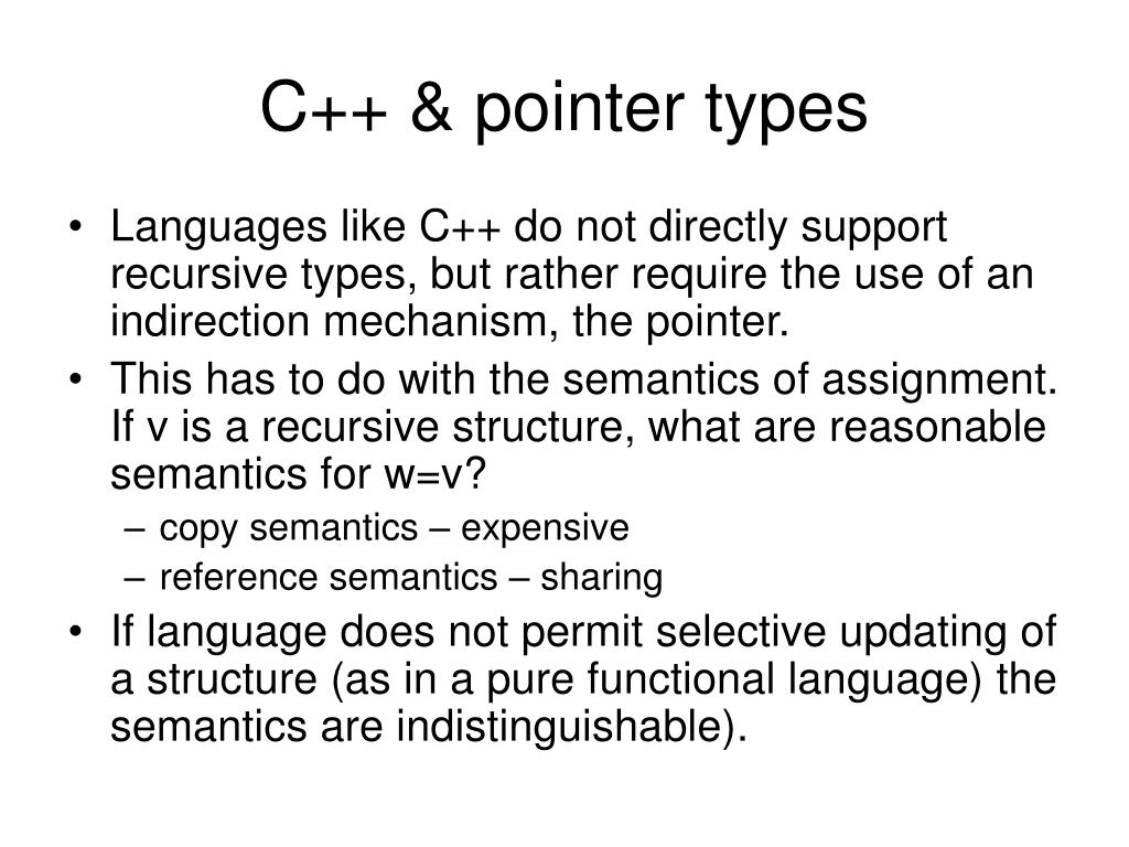 C++ & pointer types • Languages like C++ do not directly support recursive types, but rather require the use of an indirection mechanism, the pointer. • This has to do with the semantics of assignment. If v is a recursive structure, what are reasonable semantics for w=v? • copy semantics – expensive • reference semantics – sharing • If language does not permit selective updating of a structure (as in a pure functional language) the semantics are indistinguishable).