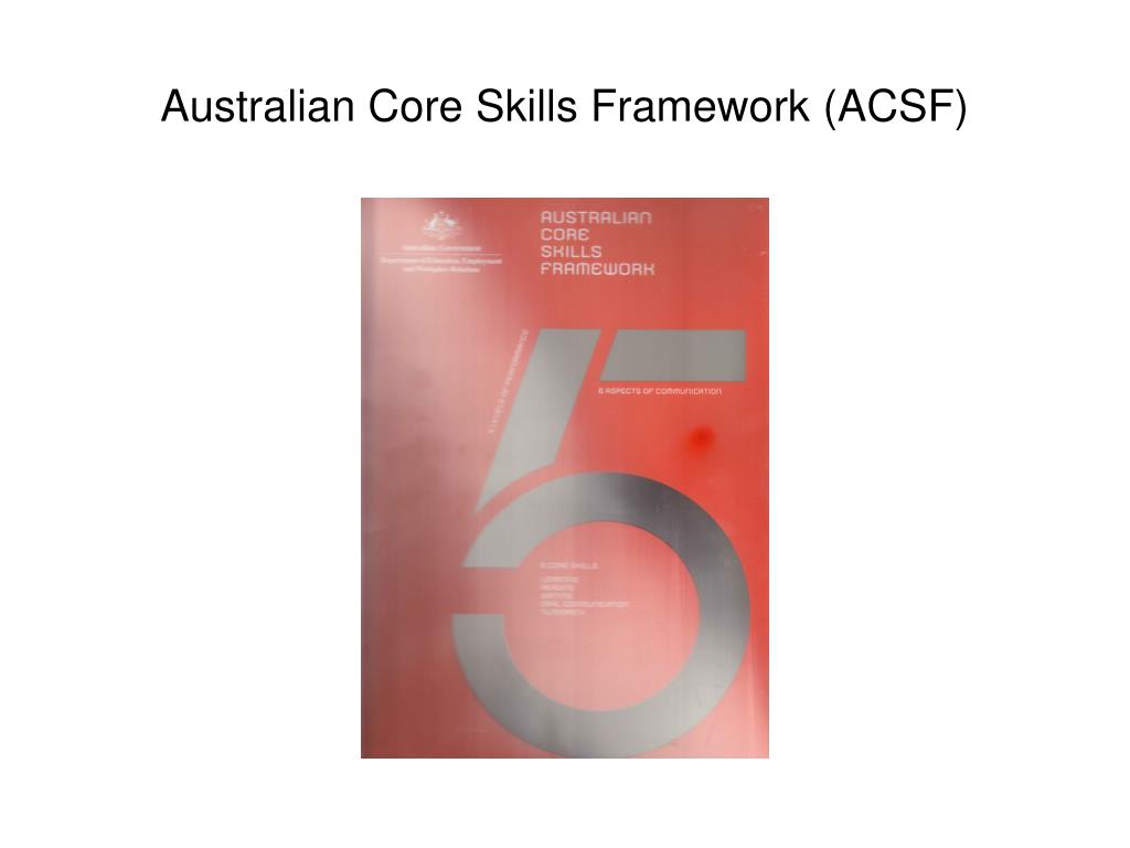 Applications and Key features of the ACSF http://www.deewr.gov.au/Skills/Programs/LitandNum/WorkplaceEnglishLanguageandLiteracy/Documents/AustralianCoreSkillsFramework.pdf Retrieved 15 March 2011, pp. 3-5.