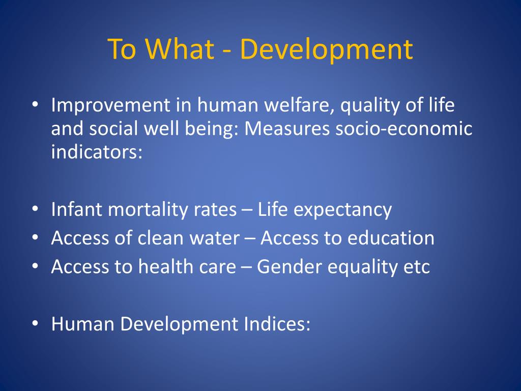 To What - Development • Improvement in human welfare, quality of life and social well being: Measures socio-economic indicators: • Infant mortality rates – Life expectancy • Access of clean water – Access to education • Access to health care – Gender equality etc • Human Development Indices: