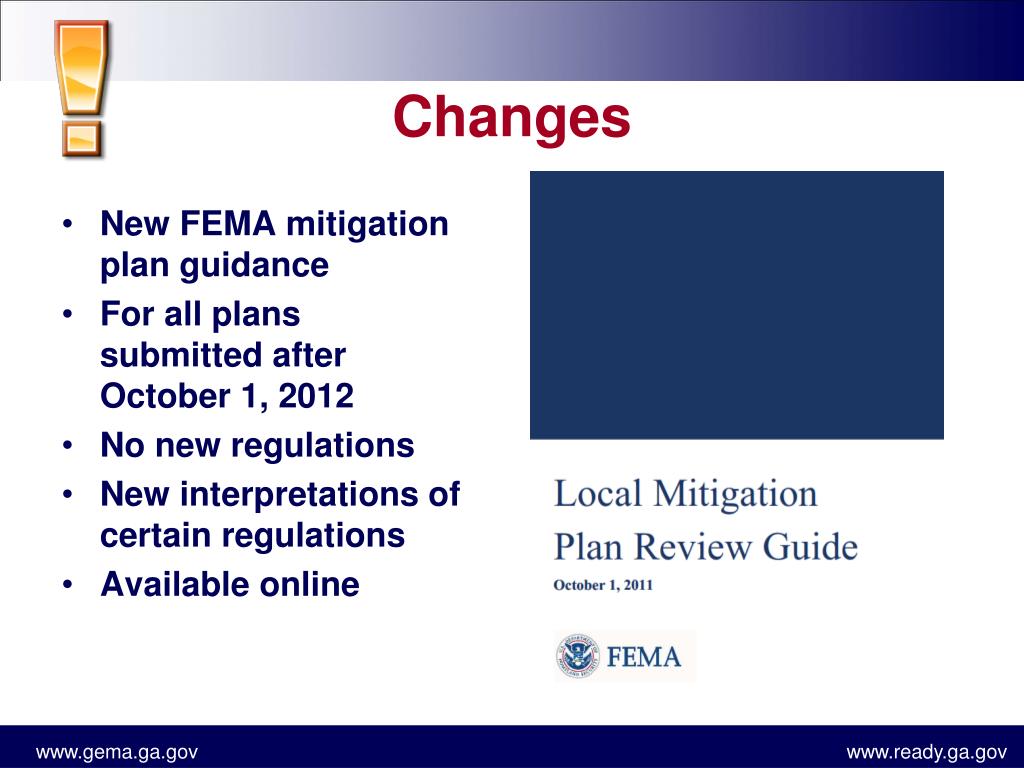 Changes • New FEMA mitigation plan guidance • For all plans submitted after October 1, 2012 • No new regulations • New interpretations of certain regulations • Available online