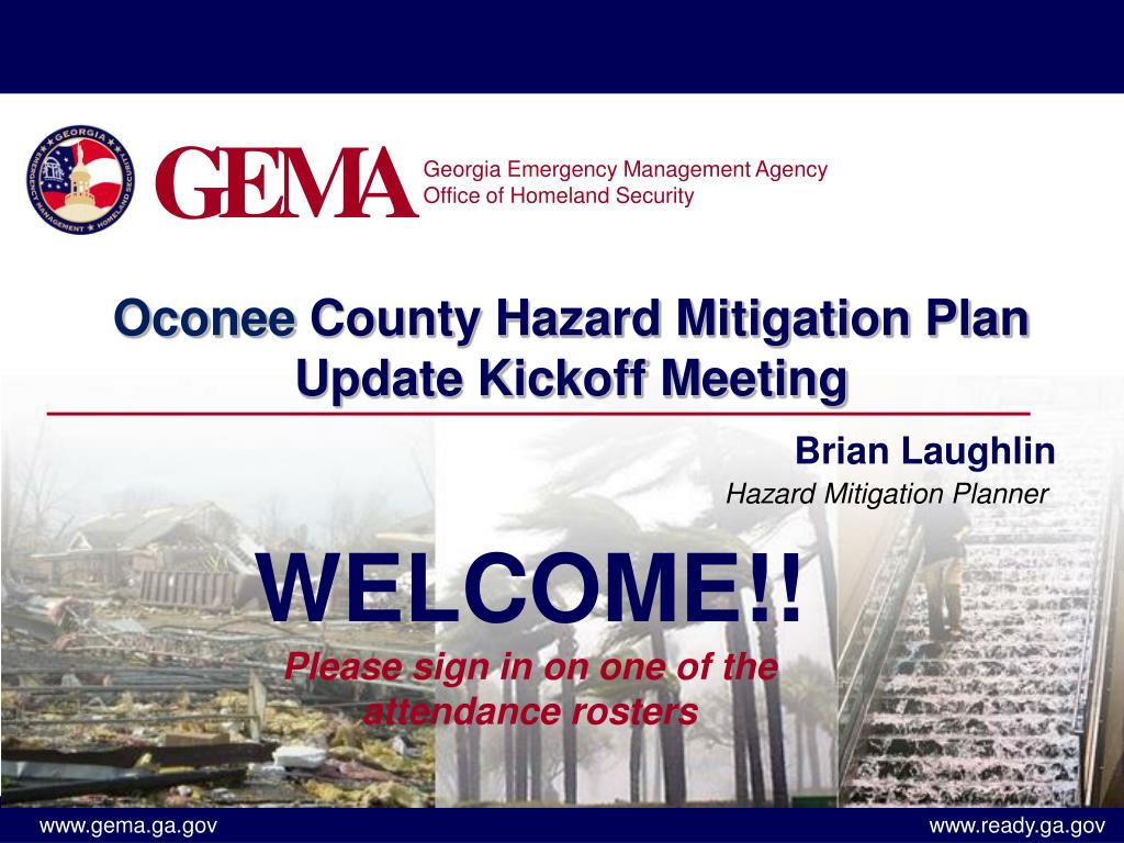 G. E. M. A. Georgia Emergency Management Agency Office of Homeland Security. Oconee County Hazard Mitigation Plan Update Kickoff Meeting. Brian Laughlin. Hazard Mitigation Planner. WELCOME!! Please sign in on one of the attendance rosters.