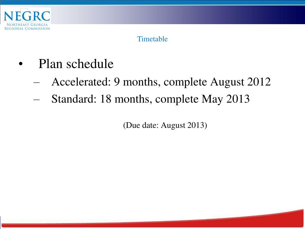 Timetable Plan schedule Accelerated: 9 months, complete August 2012 Standard: 18 months, complete May 2013 (Due date: August 2013)