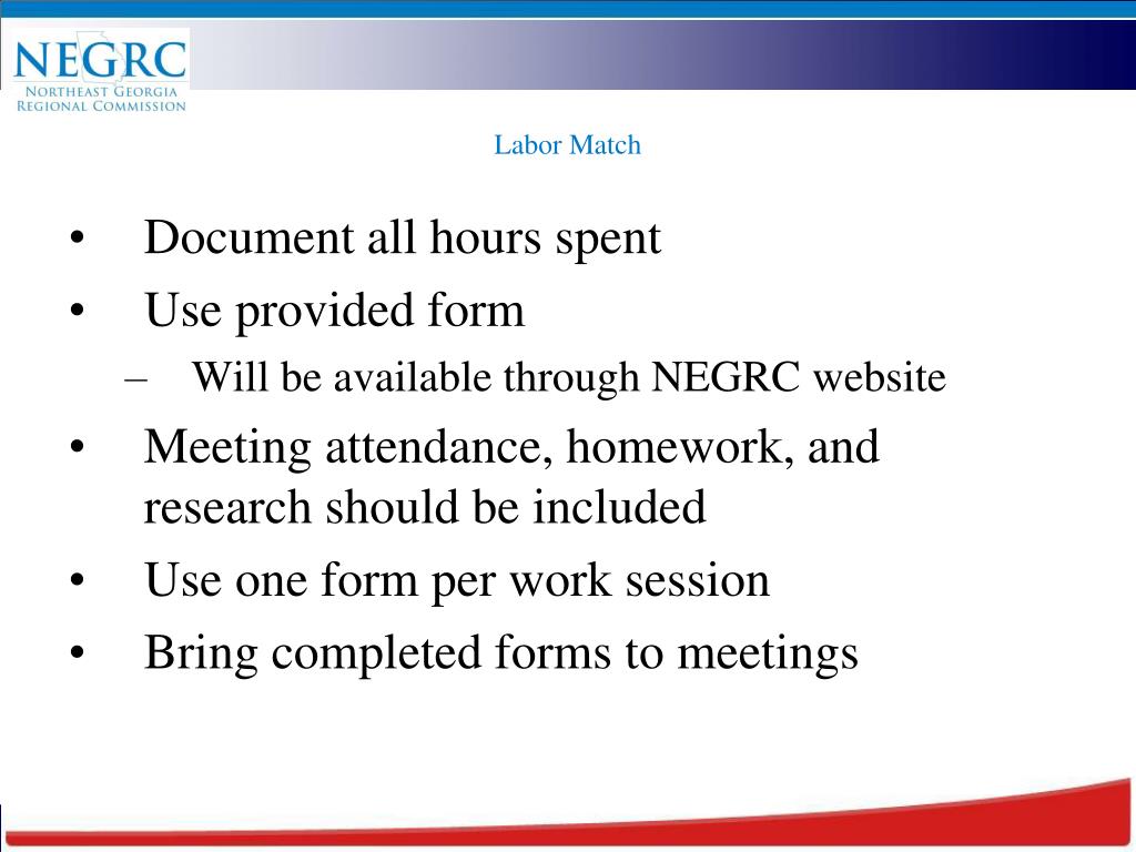 Labor Match Document all hours spent Use provided form Will be available through NEGRC website Meeting attendance, homework, and research should be included Use one form per work session Bring completed forms to meetings