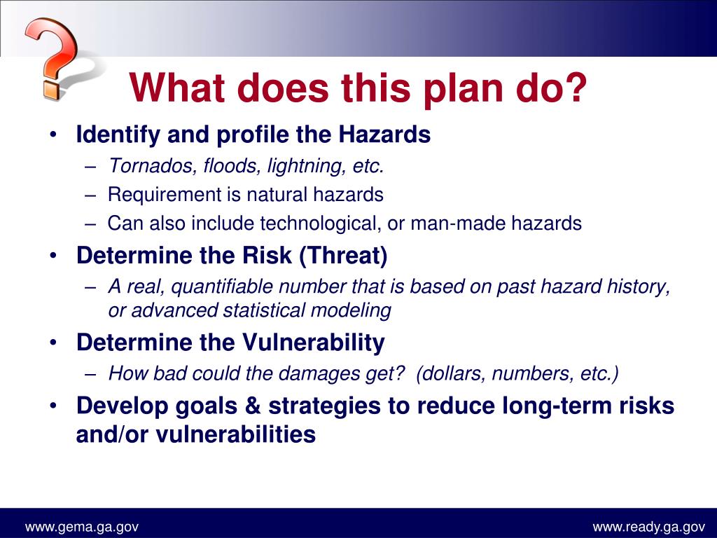 What does this plan do? • Identify and profile the Hazards • Tornados, floods, lightning, etc. • Requirement is natural hazards • Can also include technological, or man-made hazards • Determine the Risk (Threat) • A real, quantifiable number that is based on past hazard history, or advanced statistical modeling • Determine the Vulnerability • How bad could the damages get? (dollars, numbers, etc.) • Develop goals & strategies to reduce long-term risks and/or vulnerabilities
