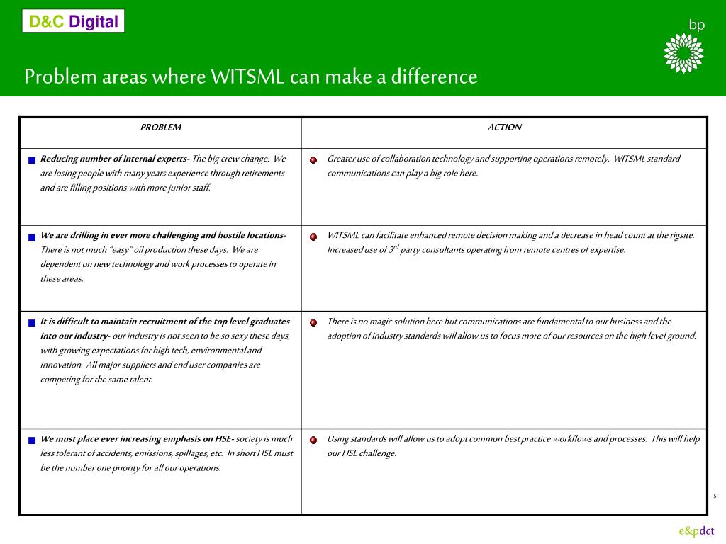 BP’s WITSML data management vision • Very strong focus on driving the marketplace to embrace the enhanced capabilities of WITSML – eg. plug & play of intelligent algorithms and tools. • Develop a truly open environment for information exchange. Share data between BP and vendors/service providers, partners and regulatory/statutory reporting bodies. • Single point data entry. • Pre-populate the Daily Report (DIMS/OpenWells) • Update designs with changes between BP and contractors • Maximise data entry automation