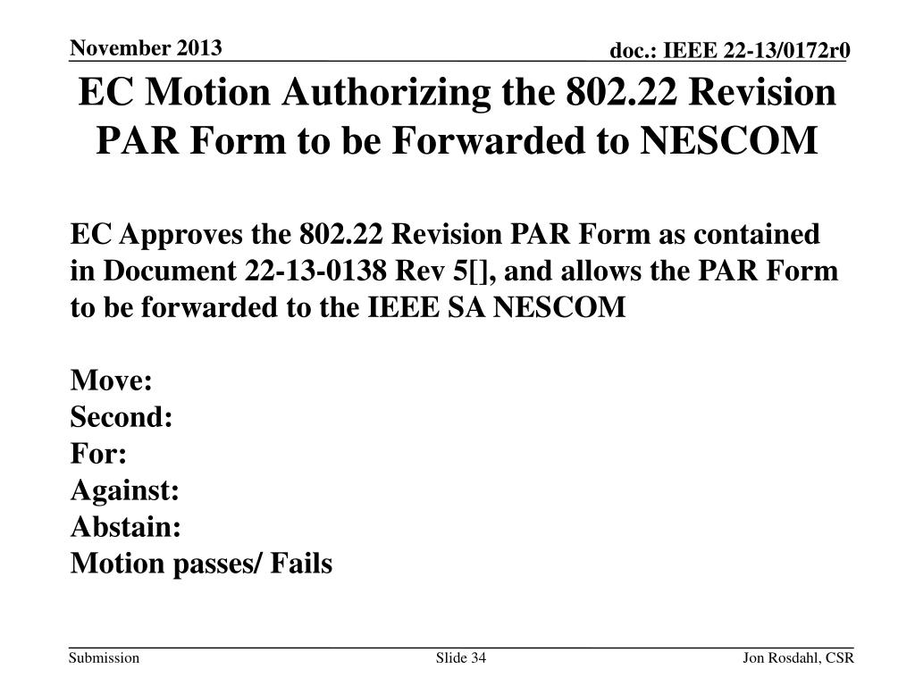 EC Motion Authorizing the 802.22 Revision PAR Form to be Forwarded to NESCOM EC Approves the 802.22 Revision PAR Form as contained in Document 22-13-0138 Rev 5[], and allows the PAR Form to be forwarded to the IEEE SA NESCOM Move: Second: For: Against: Abstain: Motion passes/ Fails Jon Rosdahl, CSR