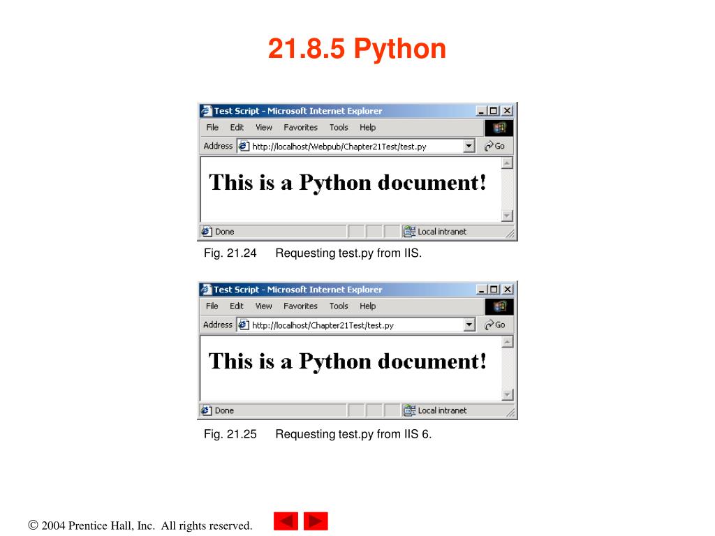 21.8.5 Python • Request Python documents from IIS 5 and 6 • Launch Internet Explorer • Enter Python document’s location in the Address field • Request Python documents from Apache Web server • Put Python documents in cgi-bin directory • Launch Internet Explorer • Enter Python document’s location in Address field