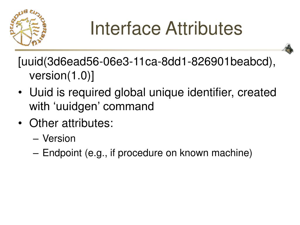 Interface Attributes [uuid(3d6ead56-06e3-11ca-8dd1-826901beabcd), version(1.0)] • Uuid is required global unique identifier, created with ‘uuidgen’ command • Other attributes: • Version • Endpoint (e.g., if procedure on known machine)