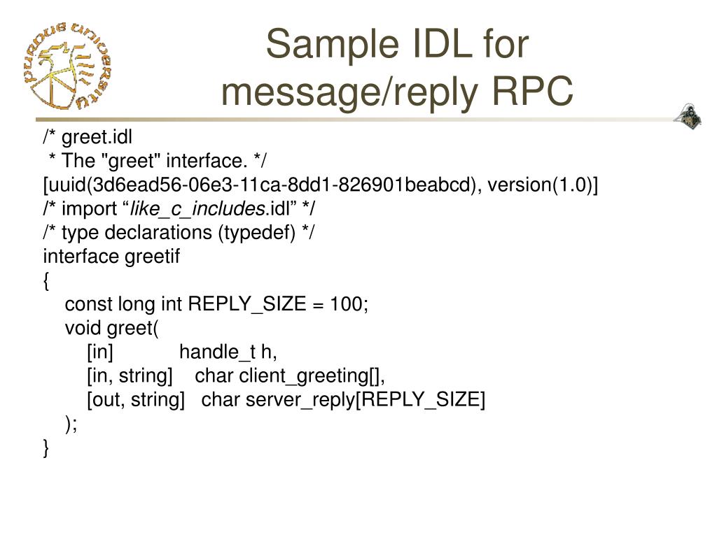 Sample IDL formessage/reply RPC /* greet.idl * The "greet" interface. */ [uuid(3d6ead56-06e3-11ca-8dd1-826901beabcd), version(1.0)] /* import “like_c_includes.idl” */ /* type declarations (typedef) */ interface greetif { const long int REPLY_SIZE = 100; void greet( [in] handle_t h, [in, string] char client_greeting[], [out, string] char server_reply[REPLY_SIZE] ); }