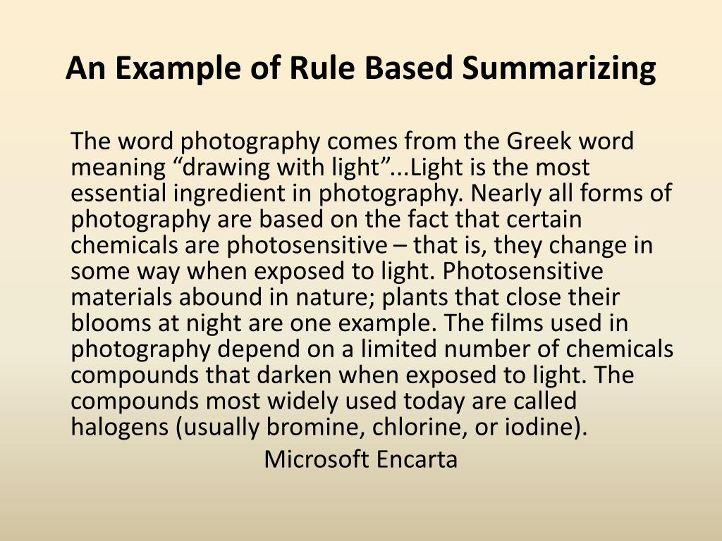 An Example of Rule Based Summarizing The word photography comes from the Greek word meaning “drawing with light”...Light is the most essential ingredient in photography. Nearly all forms of photography are based on the fact that certain chemicals are photosensitive – that is, they change in some way when exposed to light. Photosensitive materials abound in nature; plants that close their blooms at night are one example. The films used in photography depend on a limited number of chemicals compounds that darken when exposed to light. The compounds most widely used today are called halogens (usually bromine, chlorine, or iodine). Microsoft Encarta