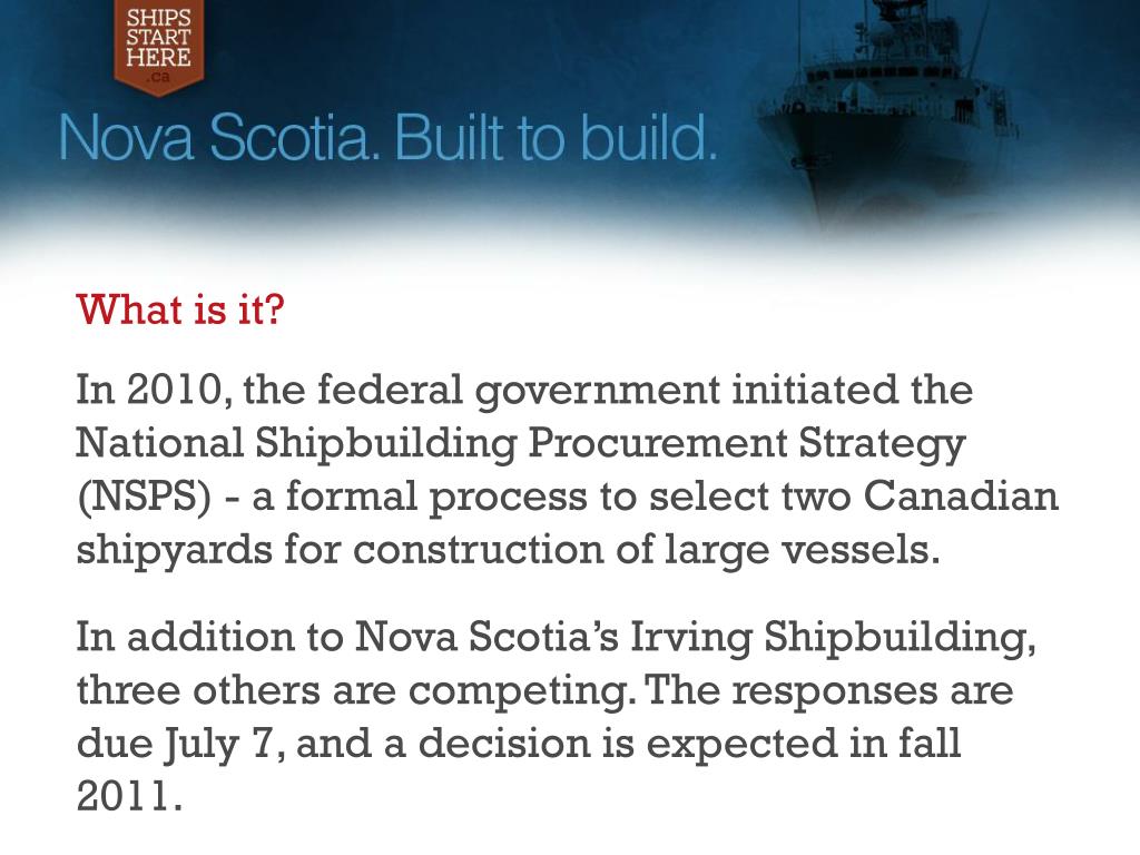 What is it? In 2010, the federal government initiated the National Shipbuilding Procurement Strategy (NSPS) - a formal process to select two Canadian shipyards for construction of large vessels. In addition to Nova Scotia’s Irving Shipbuilding, three others are competing. The responses are due July 7, and a decision is expected in fall 2011.