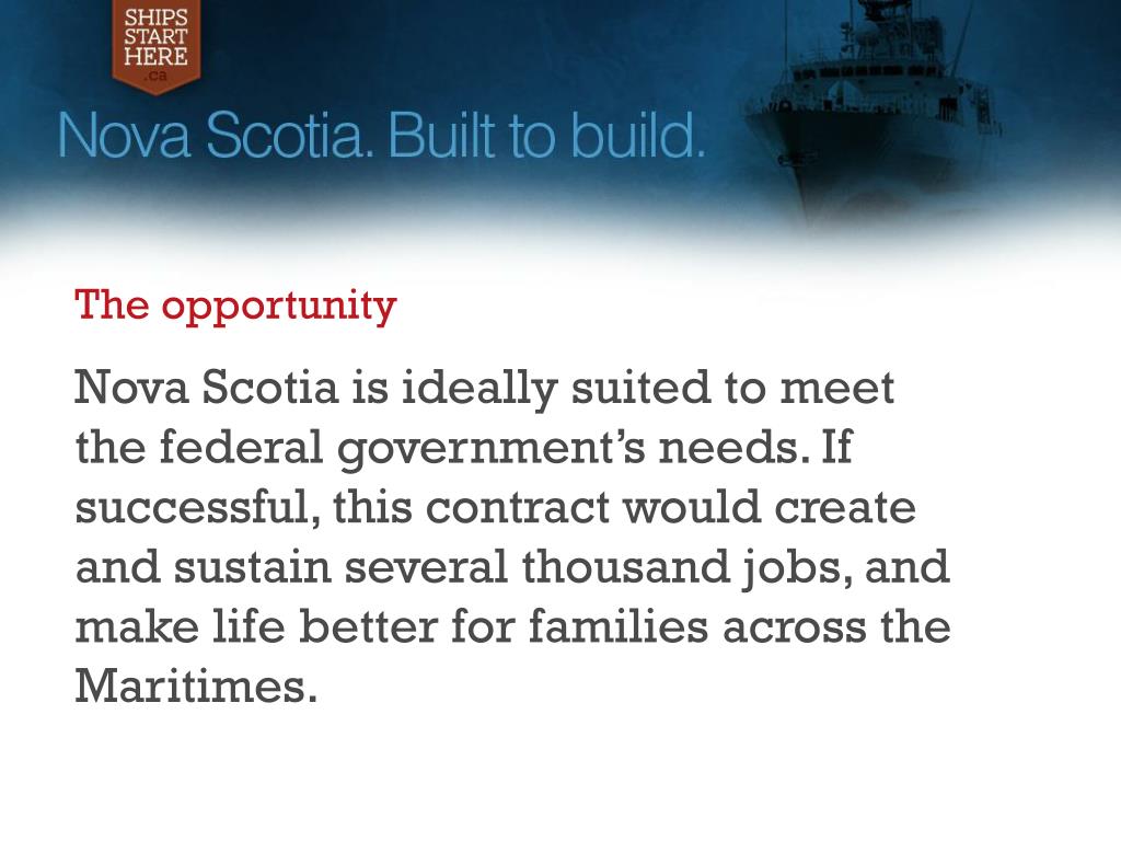 The opportunity Nova Scotia is ideally suited to meetthe federal government’s needs. If successful, this contract would create and sustain several thousand jobs, and make life better for families across the Maritimes.