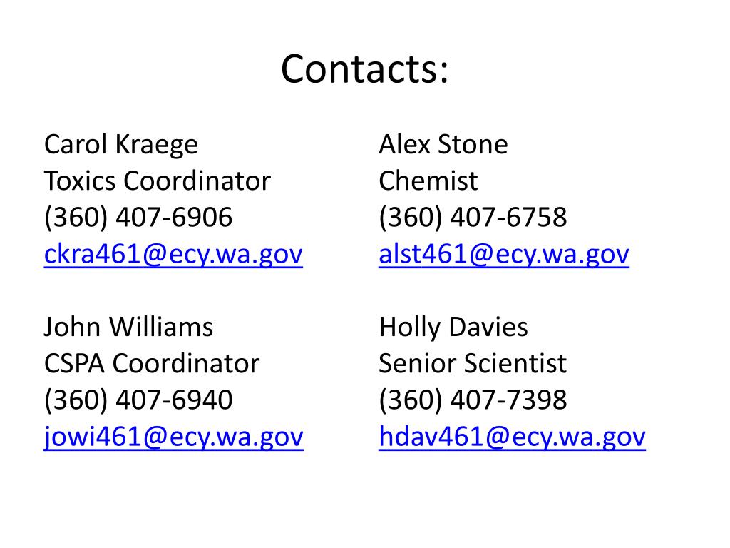 Contacts: Carol Kraege Toxics Coordinator (360) 407-6906 ckra461@ecy.wa.gov John Williams CSPA Coordinator (360) 407-6940 jowi461@ecy.wa.gov Alex Stone Chemist (360) 407-6758 alst461@ecy.wa.gov Holly Davies Senior Scientist (360) 407-7398 hdav461@ecy.wa.gov