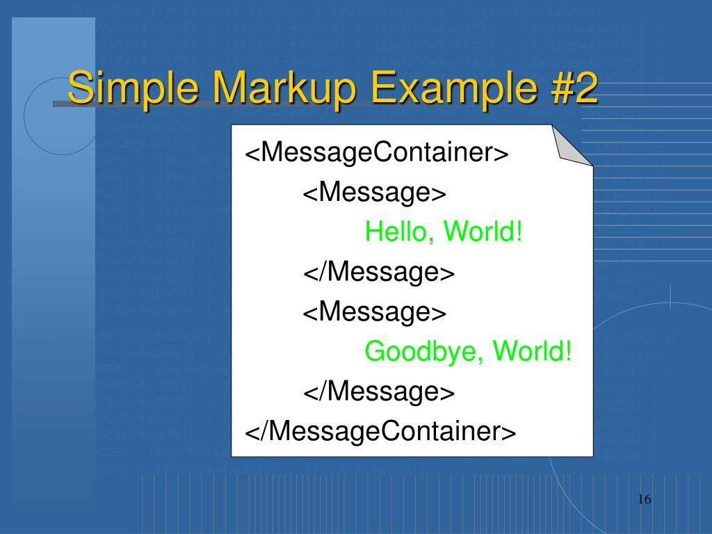 Simple Markup Example #2 <MessageContainer> <Message> Hello, World! </Message> <Message> Goodbye, World! </Message> </MessageContainer>