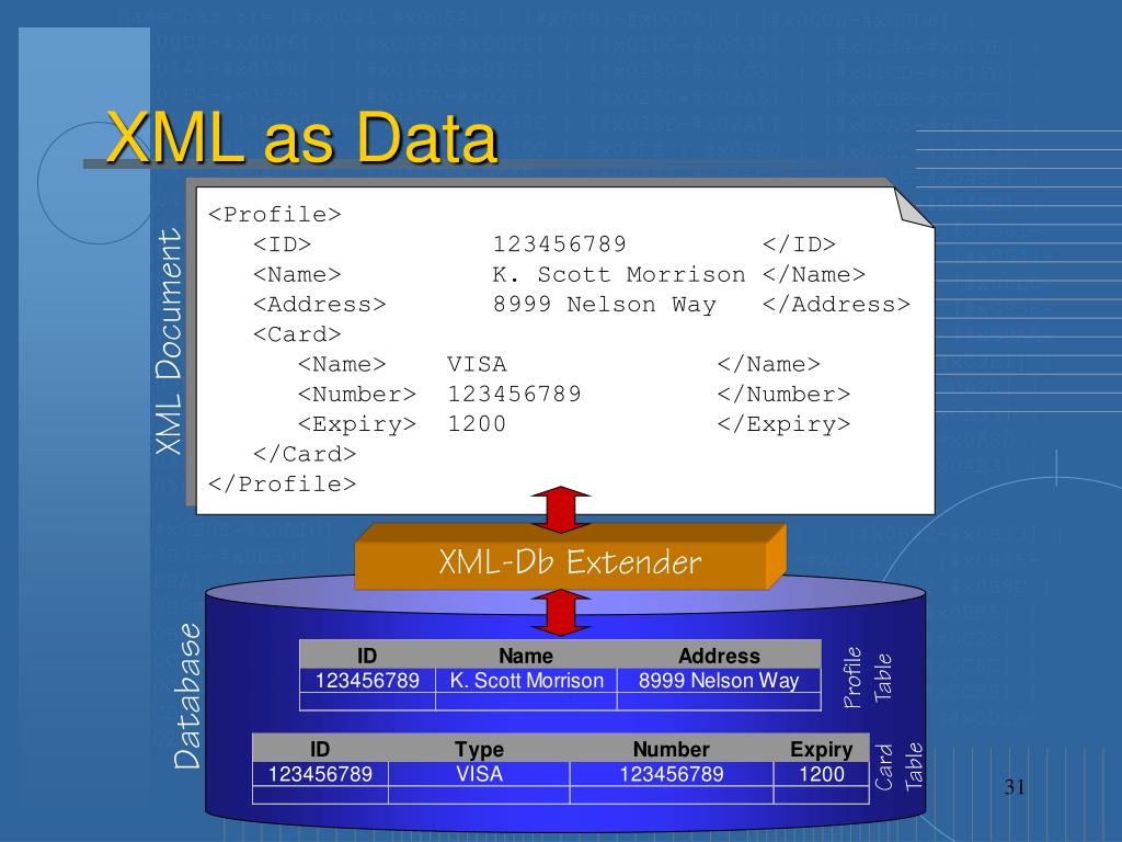 XML as Data <Profile> <ID> 123456789 </ID> <Name> K. Scott Morrison </Name> <Address> 8999 Nelson Way </Address> <Card> <Name> VISA </Name> <Number> 123456789 </Number> <Expiry> 1200 </Expiry> </Card> </Profile> XML Document XML-Db Extender Profile Table Database Card Table