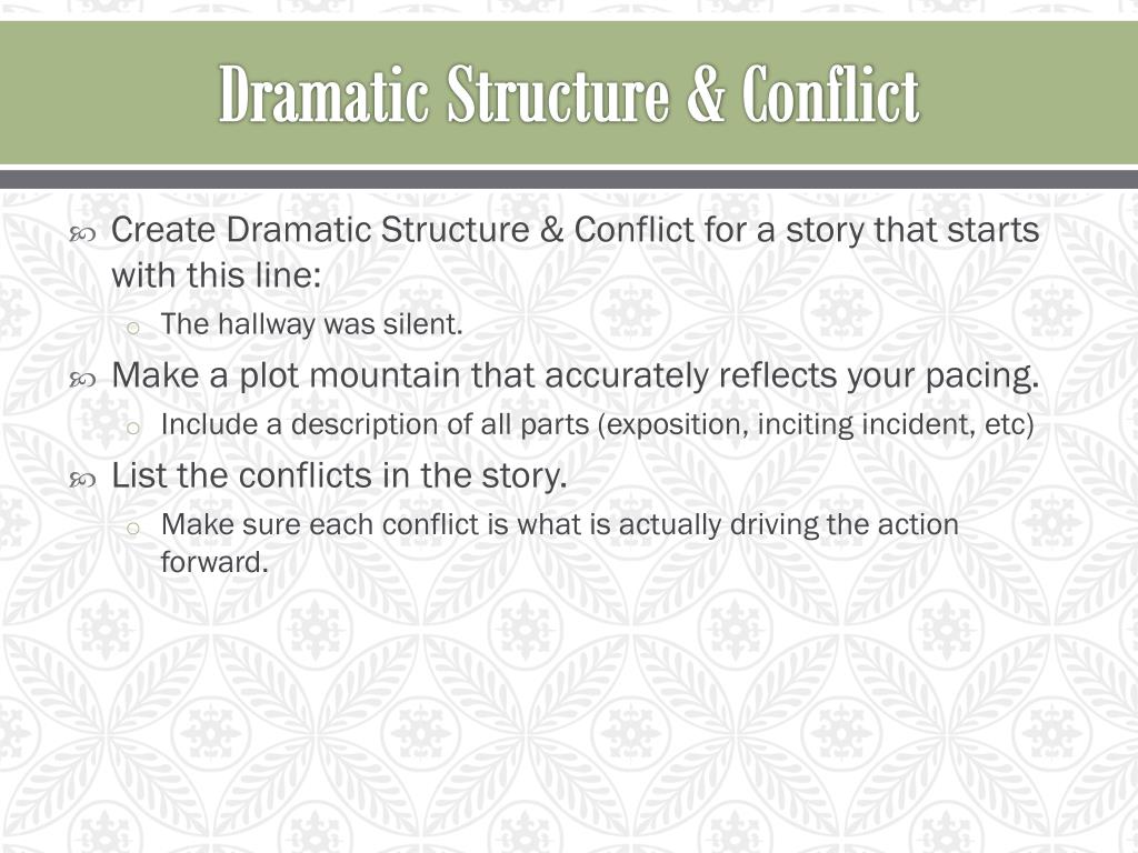Dramatic Structure & Conflict • Create Dramatic Structure & Conflict for a story that starts with this line: • The hallway was silent. • Make a plot mountain that accurately reflects your pacing. • Include a description of all parts (exposition, inciting incident, etc) • List the conflicts in the story. • Make sure each conflict is what is actually driving the action forward.