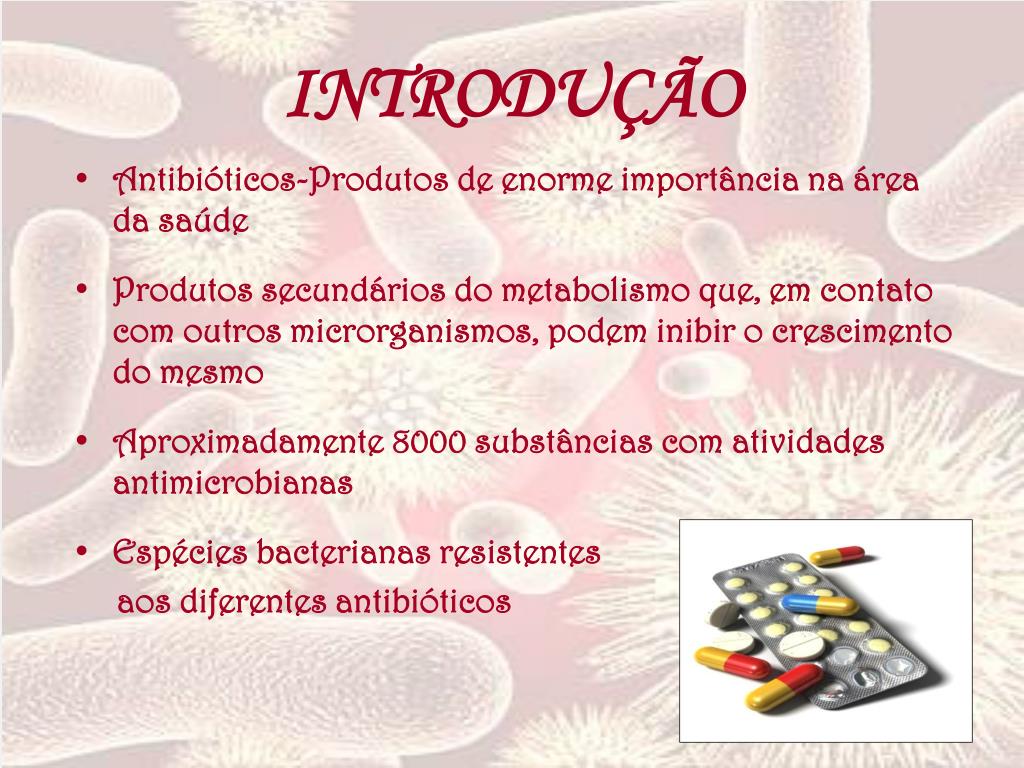 INTRODUÇÃO • Antibióticos-Produtos de enorme importância na área da saúde • Produtos secundários do metabolismo que, em contato com outros microrganismos, podem inibir o crescimento do mesmo • Aproximadamente 8000 substâncias com atividades antimicrobianas • Espécies bacterianas resistentes aos diferentes antibióticos