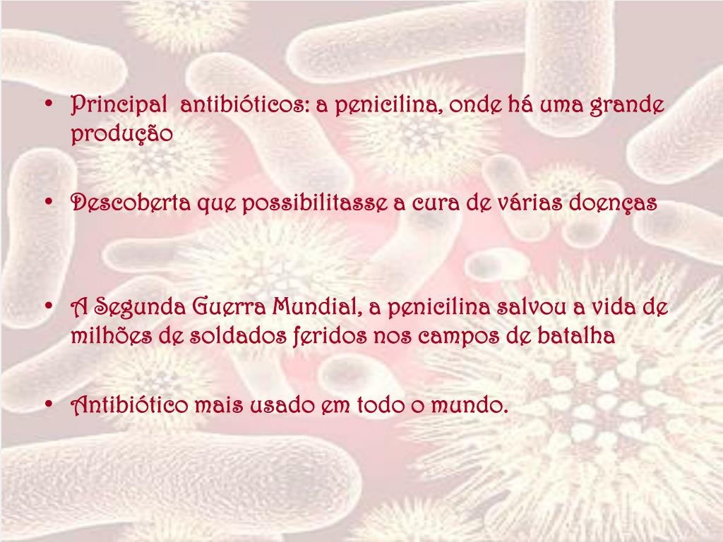 Principal antibióticos: a penicilina, onde há uma grande produção • Descoberta que possibilitasse a cura de várias doenças • A Segunda Guerra Mundial, a penicilina salvou a vida de milhões de soldados feridos nos campos de batalha • Antibiótico mais usado em todo o mundo.