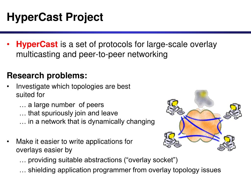 HyperCast Project • HyperCast is a set of protocols for large-scale overlay multicasting and peer-to-peer networking Research problems: • Investigate which topologies are best suited for … a large number of peers… that spuriously join and leave … in a network that is dynamically changing • Make it easier to write applications for overlays easier by … providing suitable abstractions (“overlay socket”) … shielding application programmer from overlay topology issues