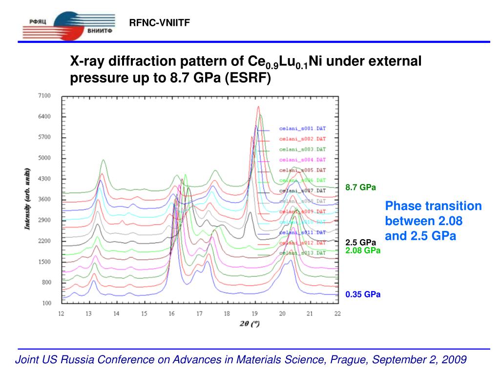 X-ray diffraction pattern of Ce0.9Lu0.1Ni under external pressure up to 8.7 GPa (ESRF) 8.7 GPa Phase transition between 2.08 and 2.5 GPa 2.5 GPa 2.08 GPa 0.35 GPa