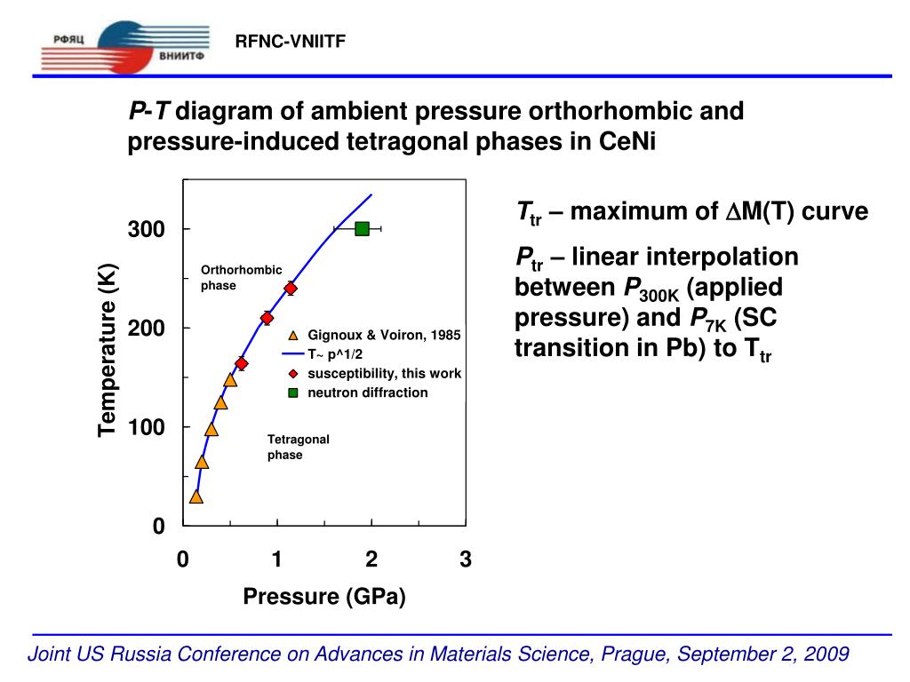 P-T diagram of ambient pressure orthorhombic and pressure-induced tetragonal phases in CeNi Ttr – maximum of M(T) curve Ptr – linear interpolation between P300K (applied pressure) and P7K (SC transition in Pb) to Ttr