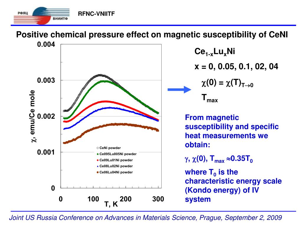 Positive chemical pressure effect on magnetic susceptibility of CeNI Ce1-xLuxNi x = 0, 0.05, 0.1, 02, 04 (0) = (T)T0 Tmax From magnetic susceptibility and specific heat measurements we obtain: , (0), Tmax 0.35T0 where T0 is the characteristic energy scale (Kondo energy) of IV system