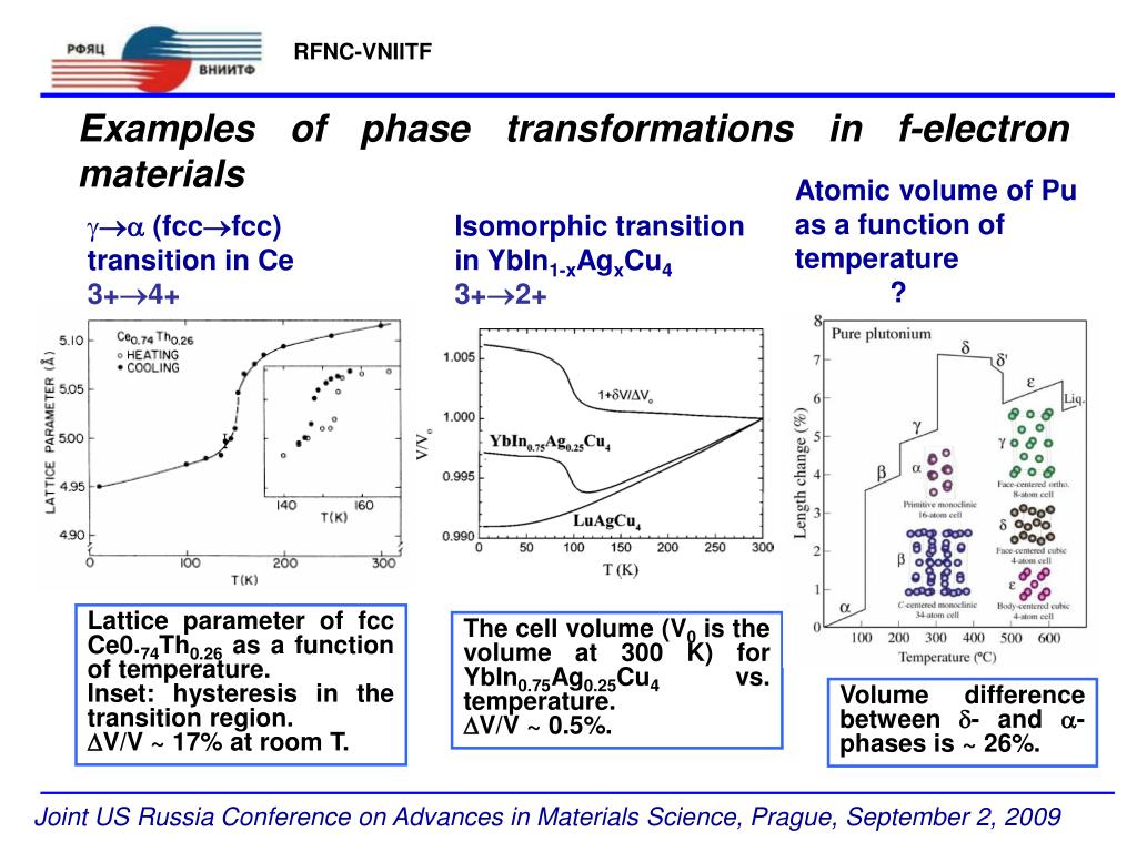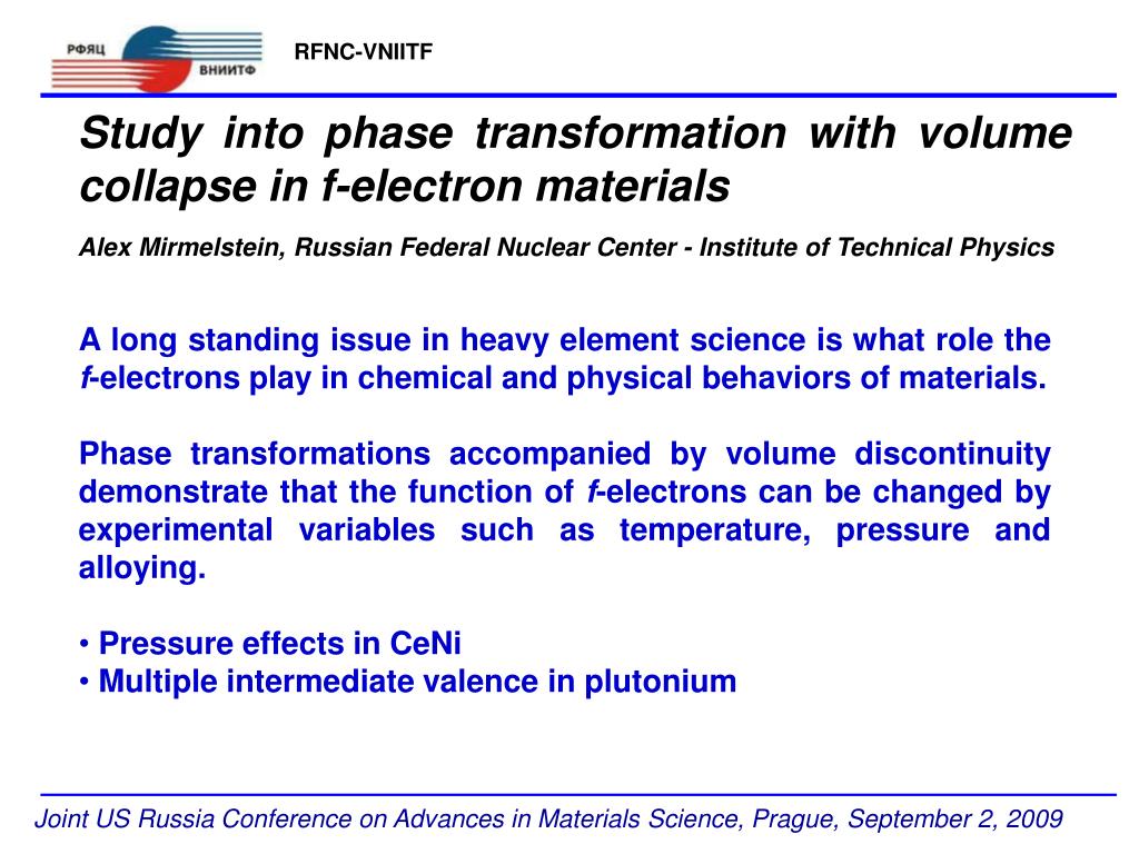 Joint US Russia Conference on Advances in Materials Science. Prague August 31- September 4 200 9. Study into phase transformation with volume collapse in f-electron materials Alex Mirmelstein, Russian Federal Nuclear Center - Institute of Technical Physics.