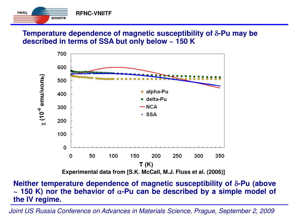 Temperature dependence of magnetic susceptibility of -Pu may be described in terms of SSA but only below ~ 150 K Experimental data from [S.K. McCall, M.J. Fluss et al. (2006)] Neither temperature dependence of magnetic susceptibility of -Pu (above ~ 150 K) nor the behavior of -Pu can be described by a simple model of the IV regime.
