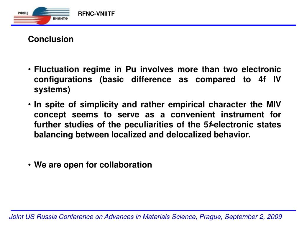 Conclusion • Fluctuation regime in Pu involves more than two electronic configurations (basic difference as compared to 4f IV systems) • In spite of simplicity and rather empirical character the MIV concept seems to serve as a convenient instrument for further studies of the peculiarities of the 5f-electronic states balancing between localized and delocalized behavior. • We are open for collaboration