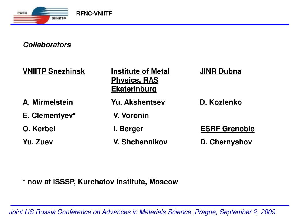 Collaborators • VNIITP SnezhinskInstitute of Metal JINR DubnaPhysics, RAS • Ekaterinburg • A. Mirmelstein Yu. Akshentsev D. Kozlenko • E. Clementyev* V. Voronin • O. Kerbel I. Berger ESRF Grenoble • Yu. Zuev V. ShchennikovD. Chernyshov • * now at ISSSP, Kurchatov Institute, Moscow