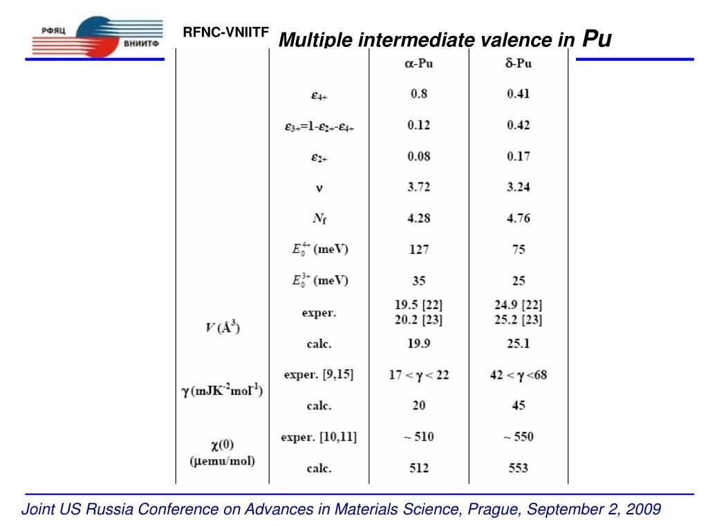 Multiple intermediate valence in Pu Entropy of transition Smag = 0.7kB /Pu atom Sphonon = 0.4kB /Pu atom[M.F. Manley et al. PRB 79(2009) 052301 ] Stotal = 1.1kB /Pu atom Stotal(exp) = 1.3kB /Pu atom