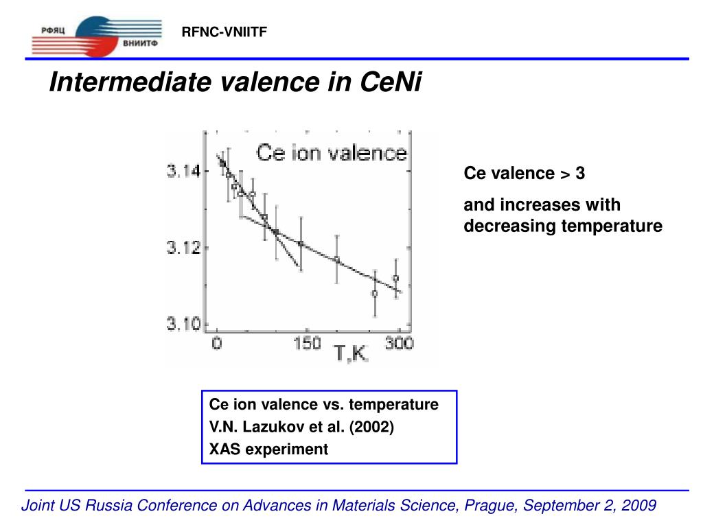 Intermediate valence in CeNi Ce valence > 3 and increases with decreasing temperature Cе ion valence vs. temperature V.N. Lazukov et al. (2002) XAS experiment