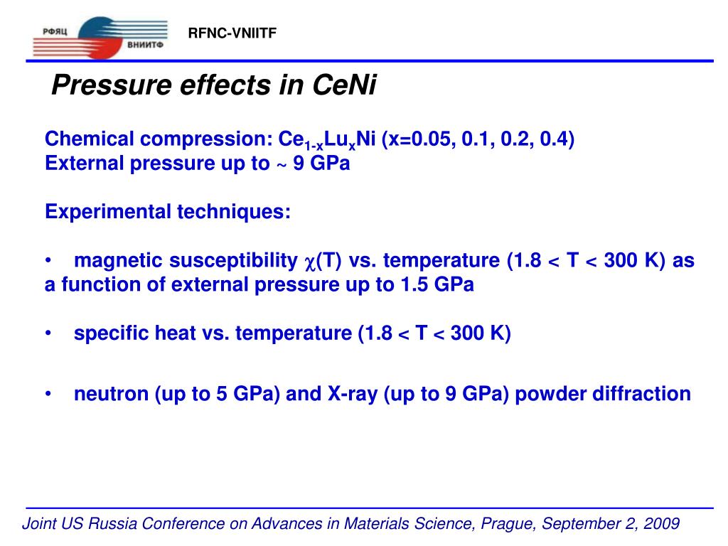 Pressure effects in CeNi • Chemical compression: Ce1-xLuxNi (x=0.05, 0.1, 0.2, 0.4) • External pressure up to ~ 9 GPa • Experimental techniques: • magnetic susceptibility (T) vs. temperature (1.8 < T < 300 K) as a function of external pressure up to 1.5 GPa • specific heat vs. temperature (1.8 < T < 300 K) • neutron (up to 5 GPa) and X-ray (up to 9 GPa) powder diffraction