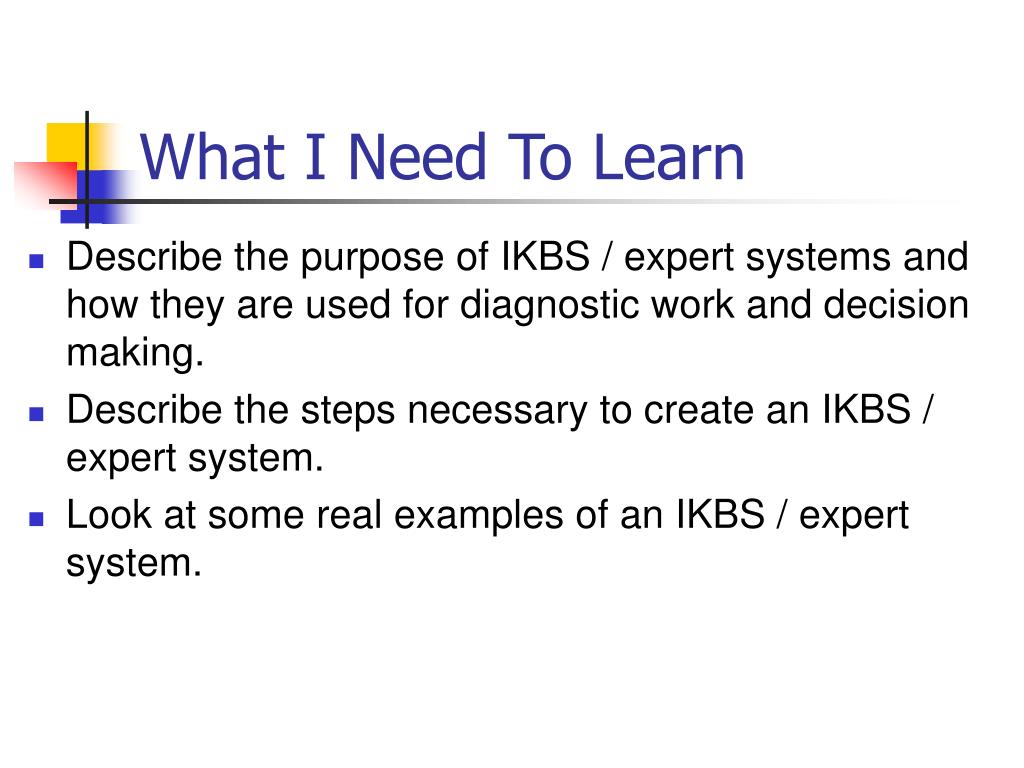 What I Need To Learn • Describe the purpose of IKBS / expert systems and how they are used for diagnostic work and decision making. • Describe the steps necessary to create an IKBS / expert system. • Look at some real examples of an IKBS / expert system.