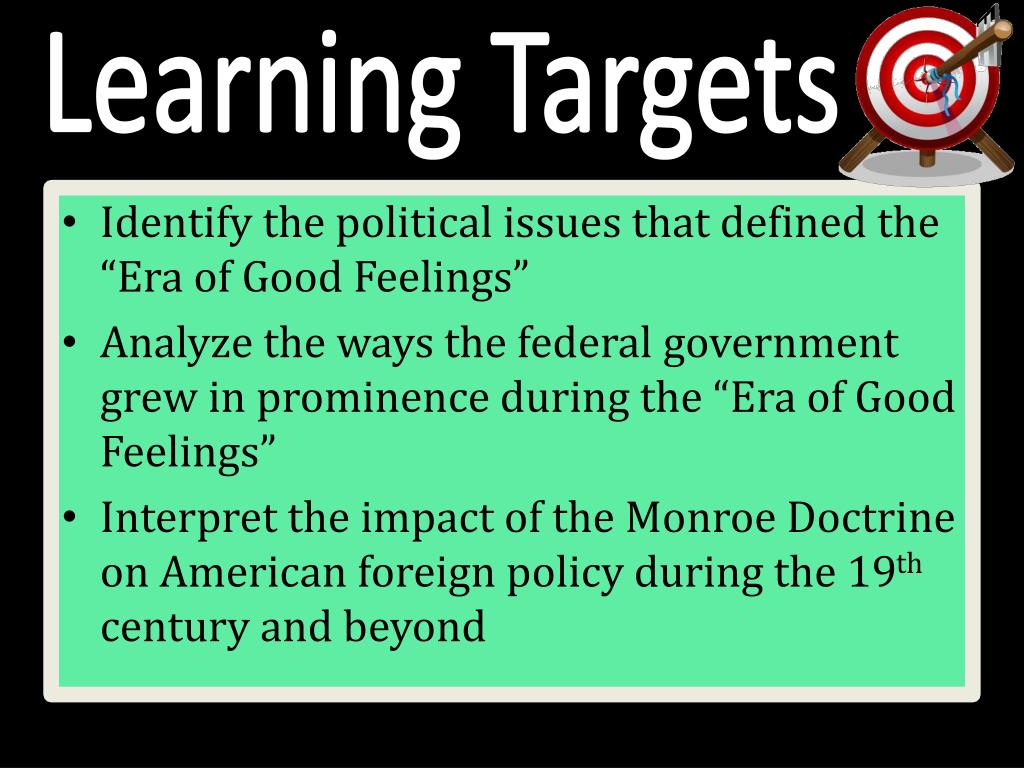 Learning Targets • Identify the political issues that defined the “Era of Good Feelings” • Analyze the ways the federal government grew in prominence during the “Era of Good Feelings” • Interpret the impact of the Monroe Doctrine on American foreign policy during the 19th century and beyond