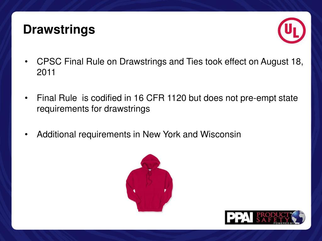 Drawstrings • CPSC Final Rule on Drawstrings and Ties took effect on August 18, 2011 • Final Rule is codified in 16 CFR 1120 but does not pre-empt state requirements for drawstrings • Additional requirements in New York and Wisconsin