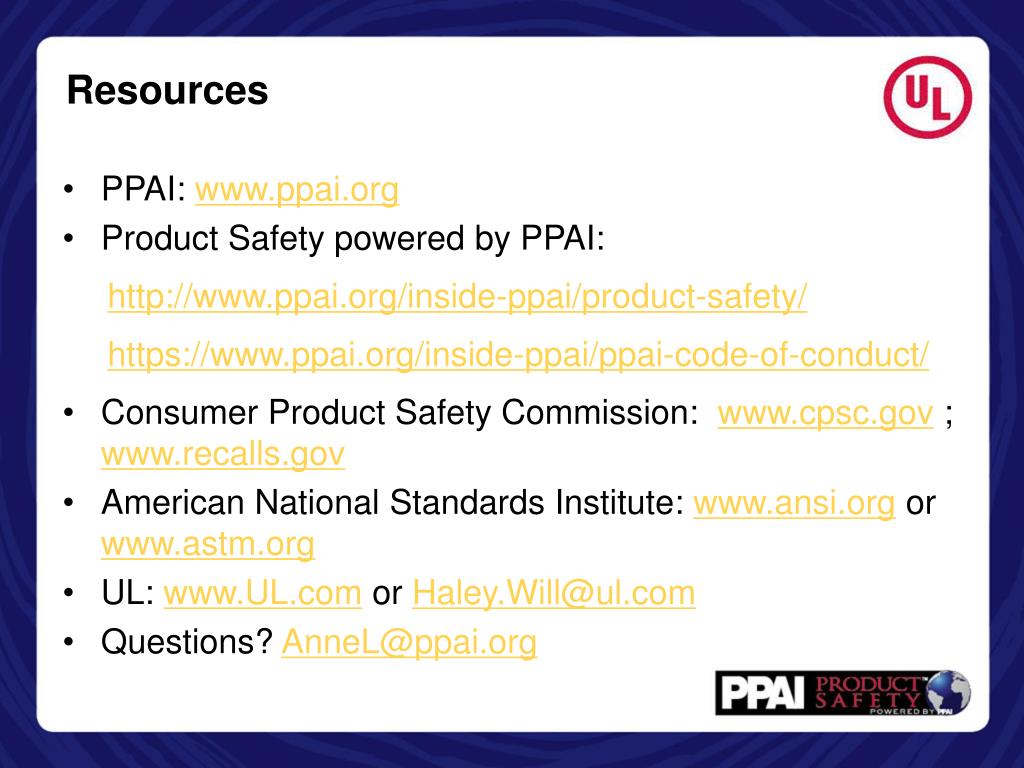 Resources • PPAI: www.ppai.org • Product Safety powered by PPAI: http://www.ppai.org/inside-ppai/product-safety/ https://www.ppai.org/inside-ppai/ppai-code-of-conduct/ • Consumer Product Safety Commission: www.cpsc.gov ; www.recalls.gov • American National Standards Institute: www.ansi.org or www.astm.org • UL: www.UL.com or Haley.Will@ul.com • Questions? AnneL@ppai.org
