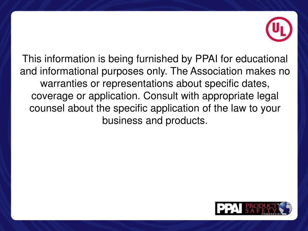 This information is being furnished by PPAI for educational and informational purposes only. The Association makes no warranties or representations about specific dates, coverage or application. Consult with appropriate legal counsel about the specific application of the law to your business and products.