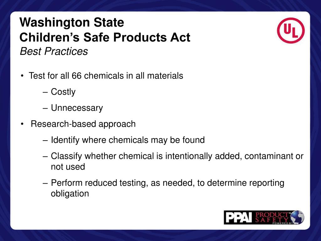 Washington State Children’s Safe Products Act Best Practices • Test for all 66 chemicals in all materials • Costly • Unnecessary • Research-based approach • Identify where chemicals may be found • Classify whether chemical is intentionally added, contaminant or not used • Perform reduced testing, as needed, to determine reporting obligation