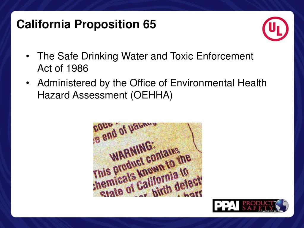 California Proposition 65 • The Safe Drinking Water and Toxic Enforcement Act of 1986 • Administered by the Office of Environmental Health Hazard Assessment (OEHHA)