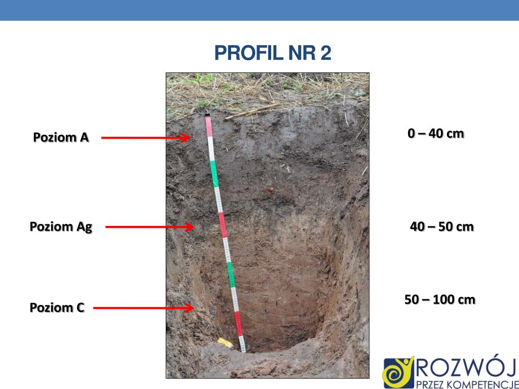Profil nr 2 0 – 40 cm Poziom A Poziom Ag 40 – 50 cm 50 – 100 cm Poziom C