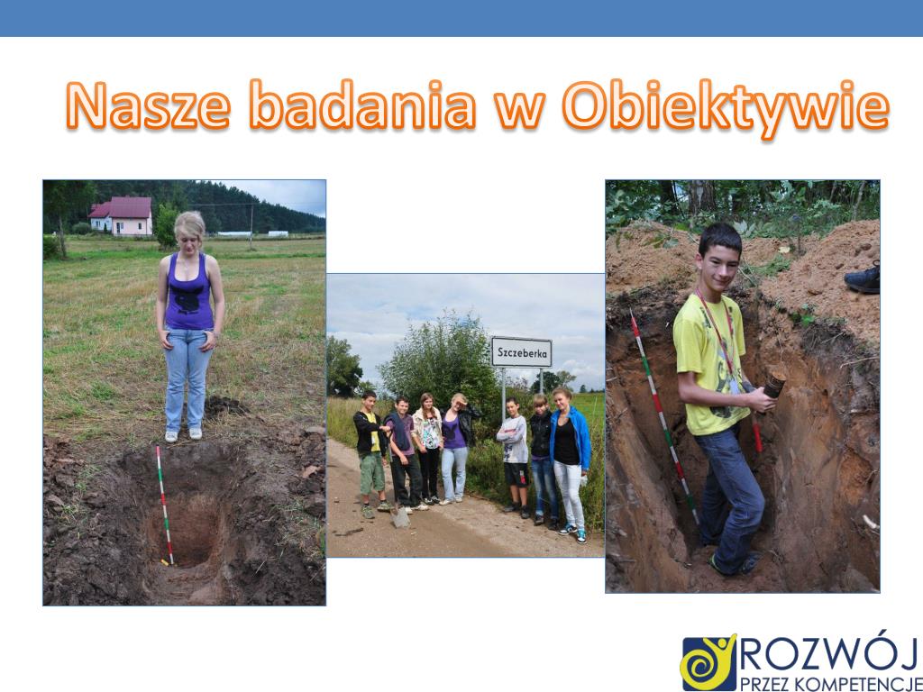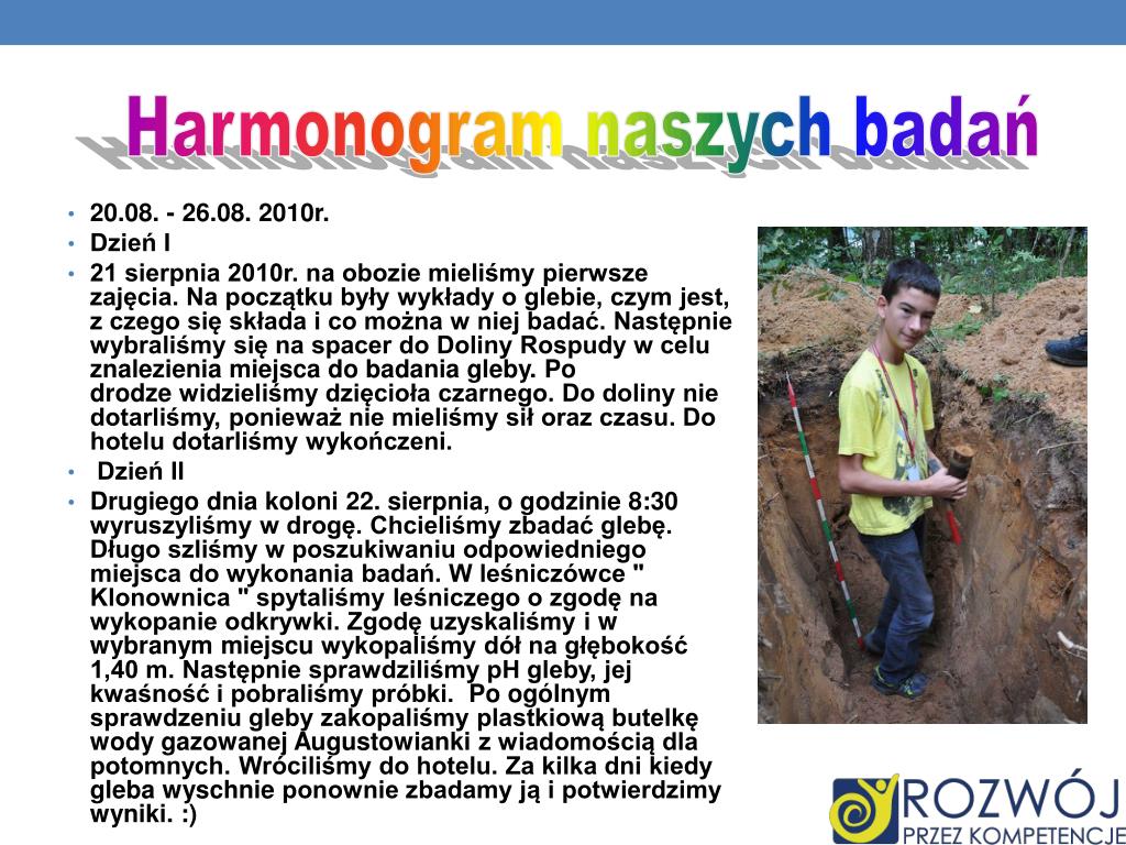 Dzień III Trzeciego dnia obozu zajęcia rozpoczęły się o 8:30 Pojechaliśmy do wsi niedaleko Augustowa. Wieś nazywała się Szczeberka. Na miejsce zawiózł nas hotelowy bus. Szukaliśmy właściciela pola, aby pozwolił nam kopać dół. Po znalezieniu odpowiedniego miejsca i zgodzie własciciela chłopcy rozpoczęli pracę. Kiedy wykopaliśmy dół głebokości 1m, zaczęliśmy badać glebę. Zbadaliśmy jej pH i zawartość węglanów w poszczególnych nasze poziomach. Pobraliśmy próbki gleby, zakopaliśmy dół i zaczęlismy iść w stronę hotelu. Po drodze odebrał nas hotelowy bus, ten sam, który zawiózł nas na miejsce. Dzień IV Dzień IV Czwartego dnia obozu poranne zajęcie odbyły się w sali Wigry w Hotelu Warszawa. Zaczeliśmy od opisania poprzednich dni w e-kronice. Następnie ponownie badaliśmy wysuszone gleby. Określaliśmy jej barwę w stanie suchym i wilgotnym przy pomocy atlasu Munsell'a. Umieściliśmy też zdjęcie wykonane w trakcje naszych badań do naszej e-kroniki. Potem podzieliśmy się na dwie grupy i przegotowaliśmy prezentację ppt zawierającą wyniki badań naszej grupy. Harmonogram naszych badań cd.