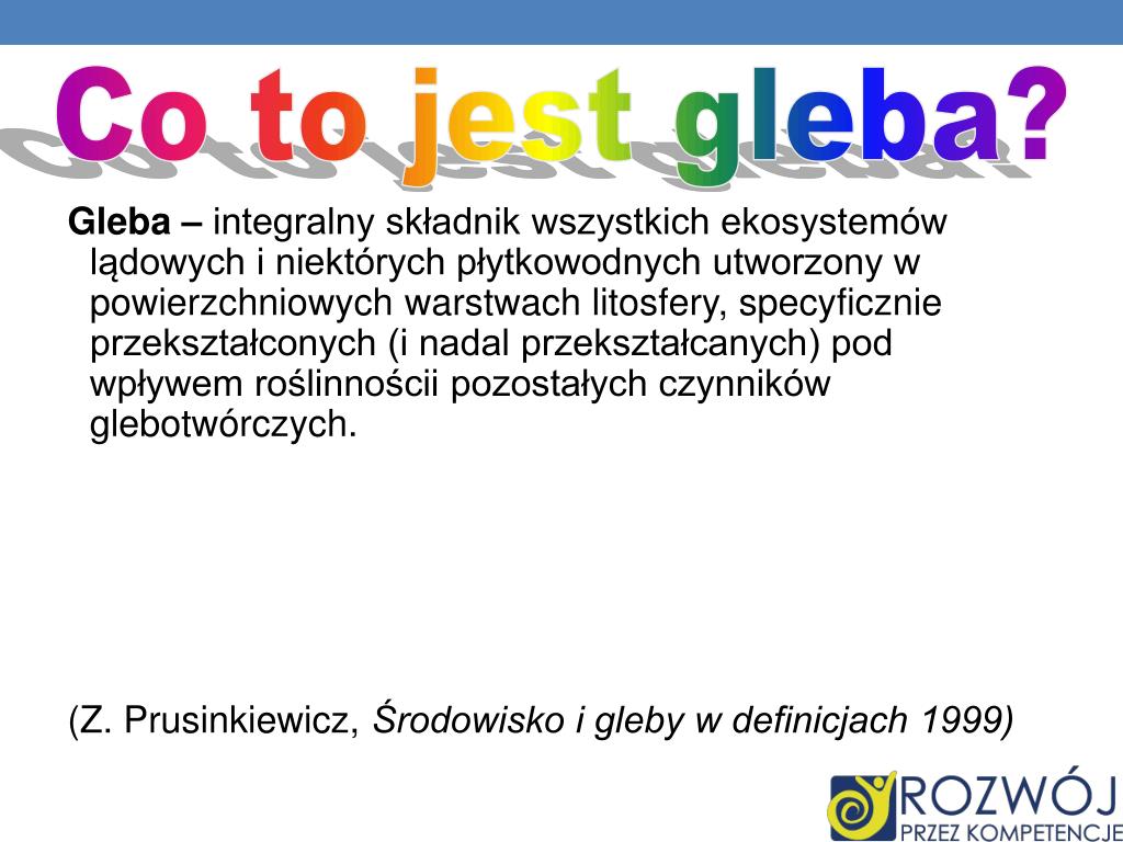 Gleba – integralny składnik wszystkich ekosystemów lądowych i niektórych płytkowodnych utworzony w powierzchniowych warstwach litosfery, specyficznie przekształconych (i nadal przekształcanych) pod wpływem roślinnościi pozostałych czynników glebotwórczych. (Z. Prusinkiewicz, Środowisko i gleby w definicjach 1999) Co to jest gleba?