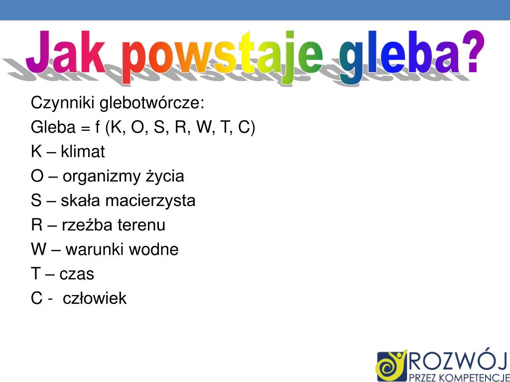 Czynniki glebotwórcze: Gleba = f (K, O, S, R, W, T, C) K – klimat O – organizmy życia S – skała macierzysta R – rzeźba terenu W – warunki wodne T – czas C - człowiek Jak powstaje gleba?