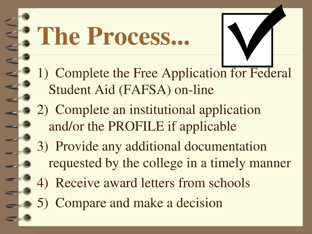The Process... 1) Complete the Free Application for Federal Student Aid (FAFSA) on-line 2) Complete an institutional application and/or the PROFILE if applicable 3) Provide any additional documentation requested by the college in a timely manner 4) Receive award letters from schools 5) Compare and make a decision